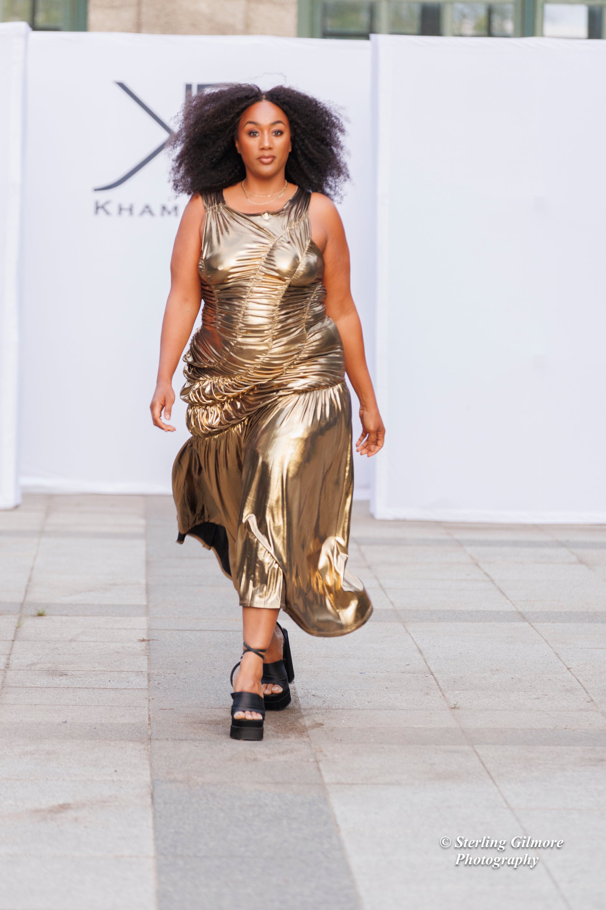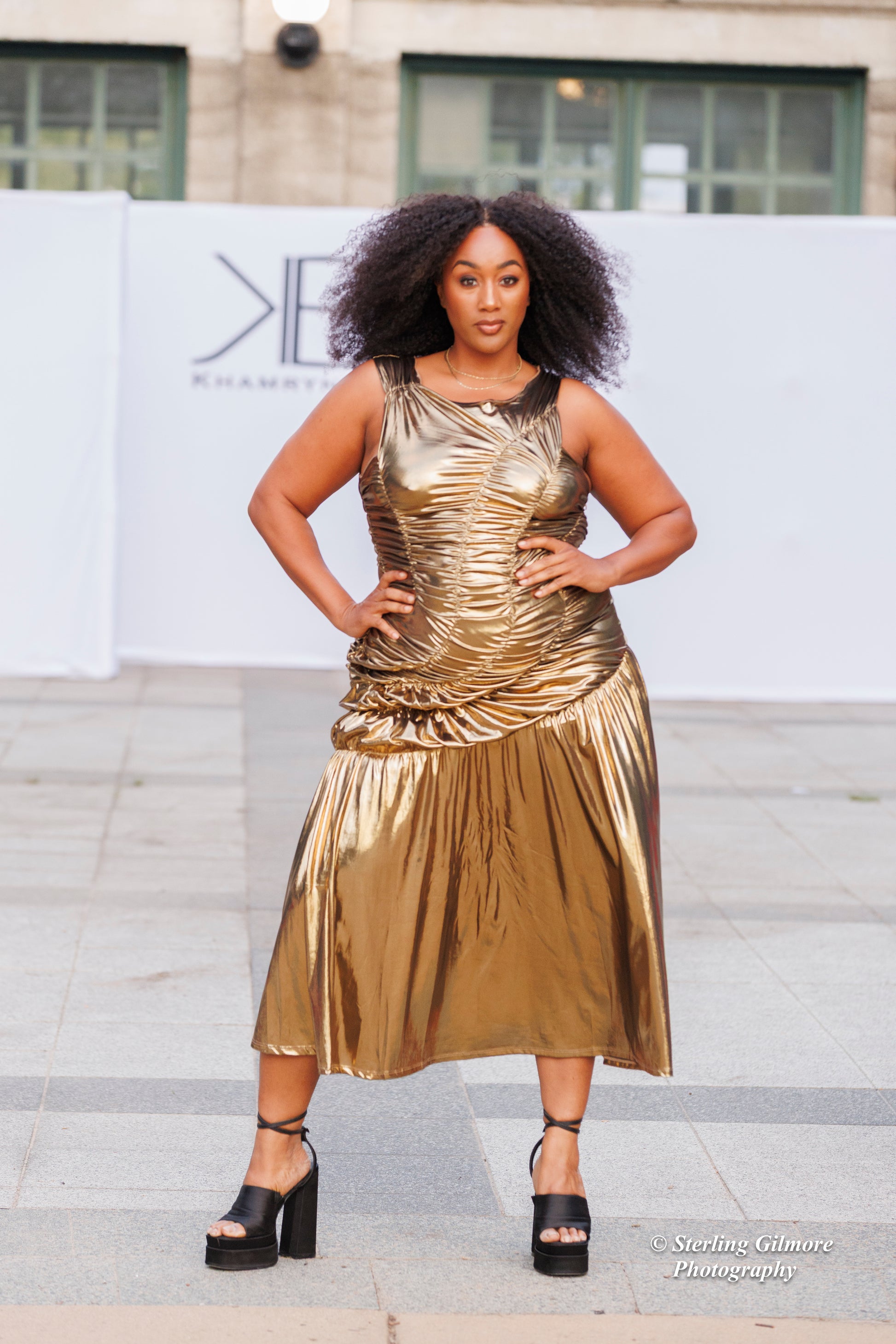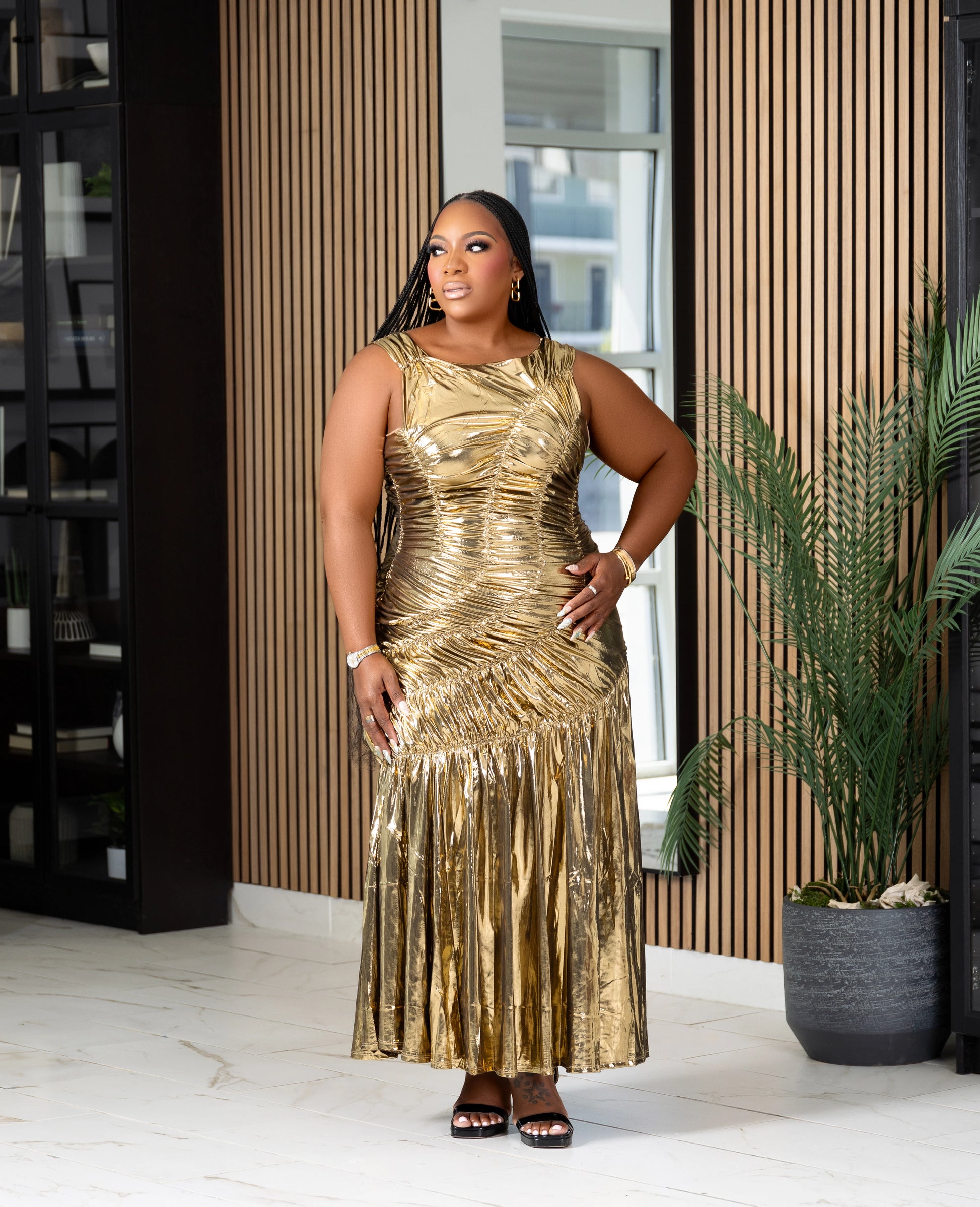 This stunning gold metallic gown features intricate ruched detailing throughout, creating a flattering and sculpted silhouette. The sleeveless design emphasizes the shoulders, while the asymmetrical ruching adds dimension and enhances curves. The dress flows into a slightly flared skirt at the bottom, providing elegant movement with every step. Perfect for making a bold and glamorous entrance, this gown radiates confidence and luxury.