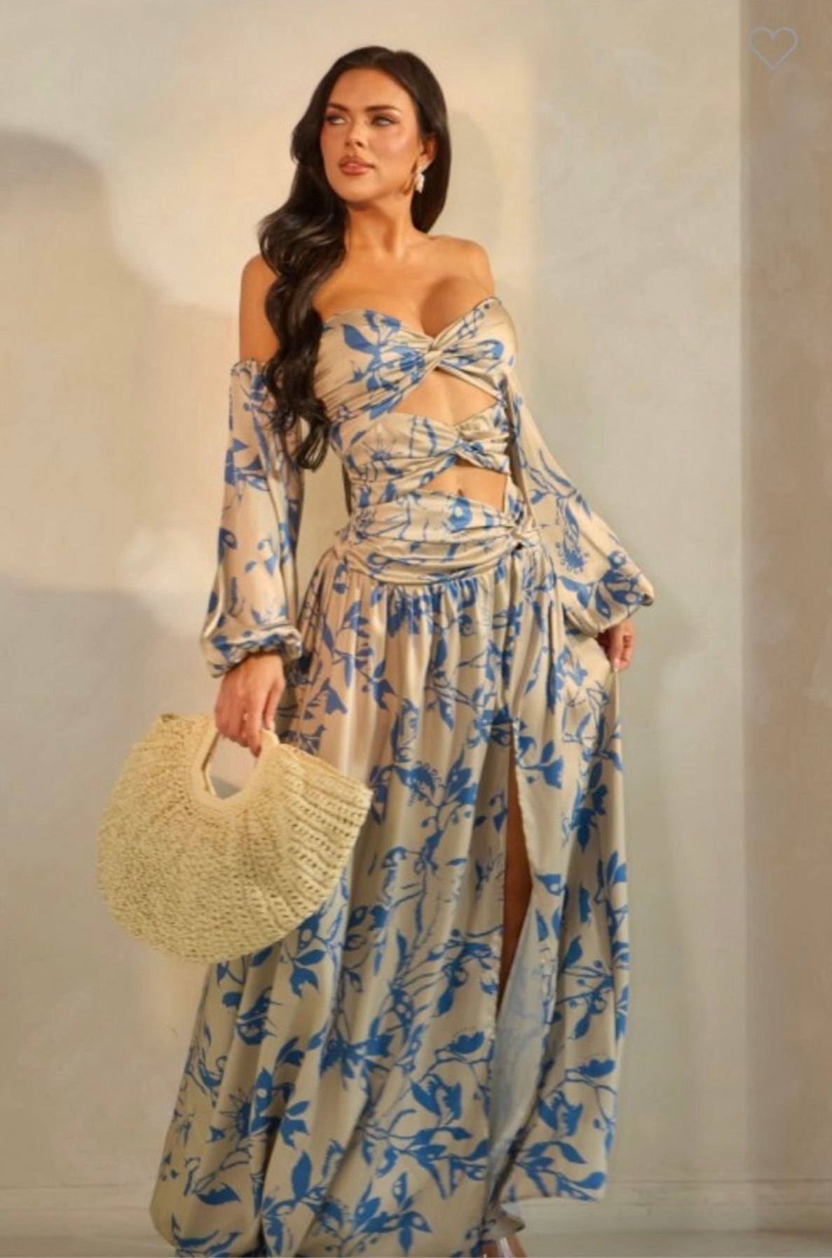 Azure Garden Maxi Dress – A dreamy off-shoulder maxi dress designed with a twist-front bodice, flattering cutouts, and flowing long sleeves. The soft beige base is beautifully contrasted with bold blue floral prints, creating a fresh and romantic vibe. The high slit adds a touch of allure, while the lightweight fabric drapes effortlessly for a graceful finish. Perfect for beachside dinners, garden parties, or a summer getaway, this dress combines elegance with a hint of bohemian charm.