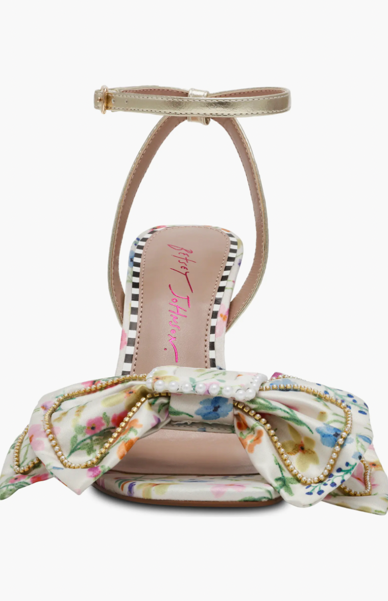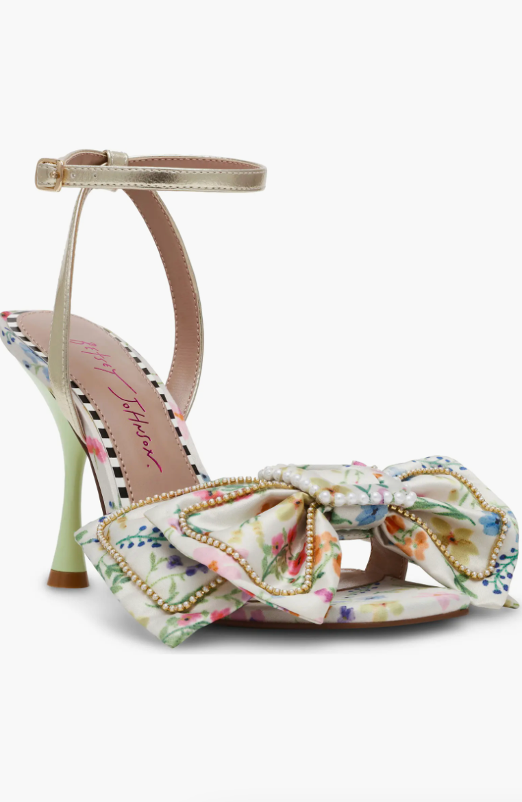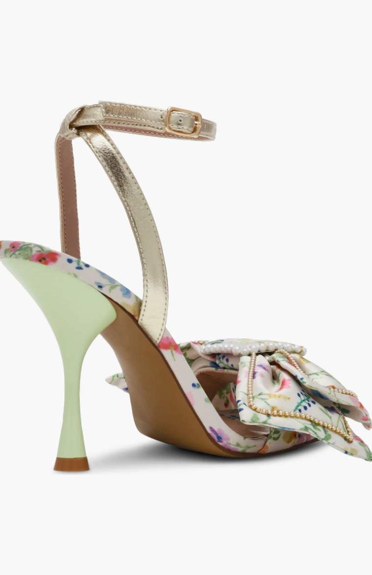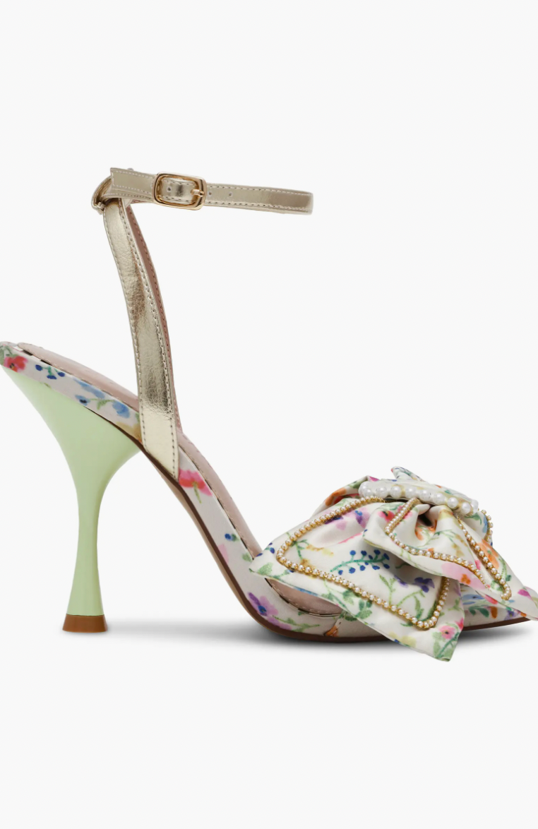 Floral bouquet–printed shoes featuring a charming bow accent framed with delicate pearl detailing. This elegant design blends romantic patterns with refined embellishments, creating a standout look that’s both stylish and feminine.