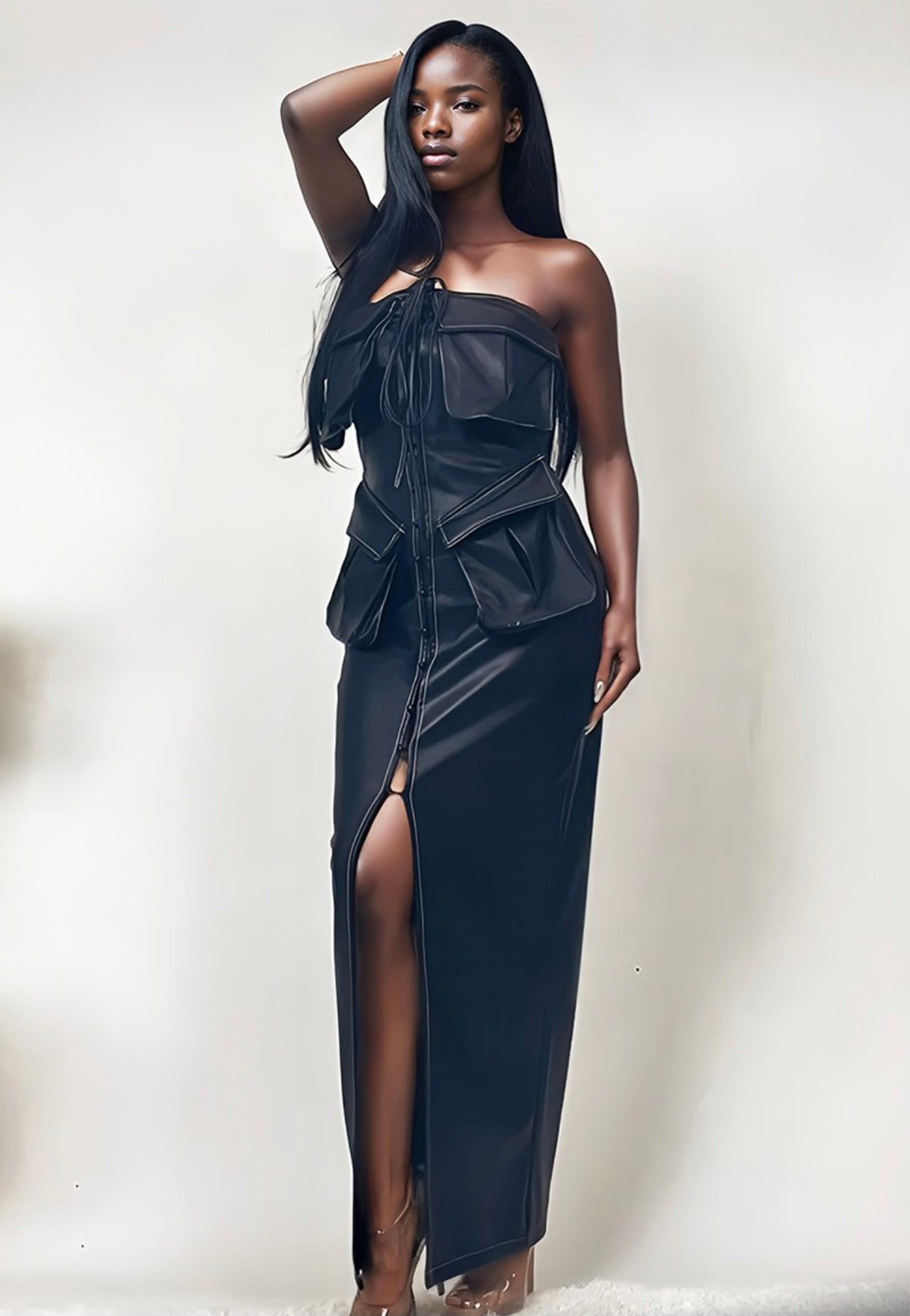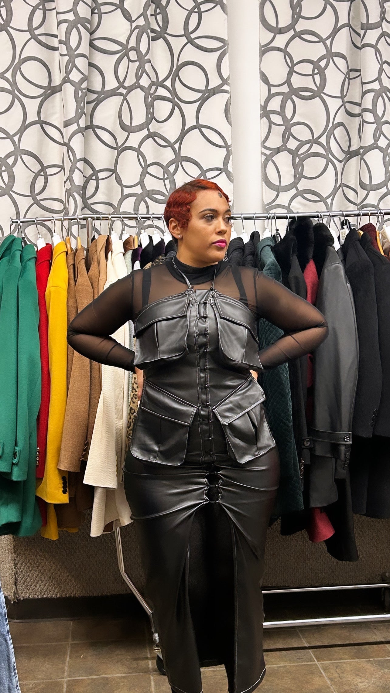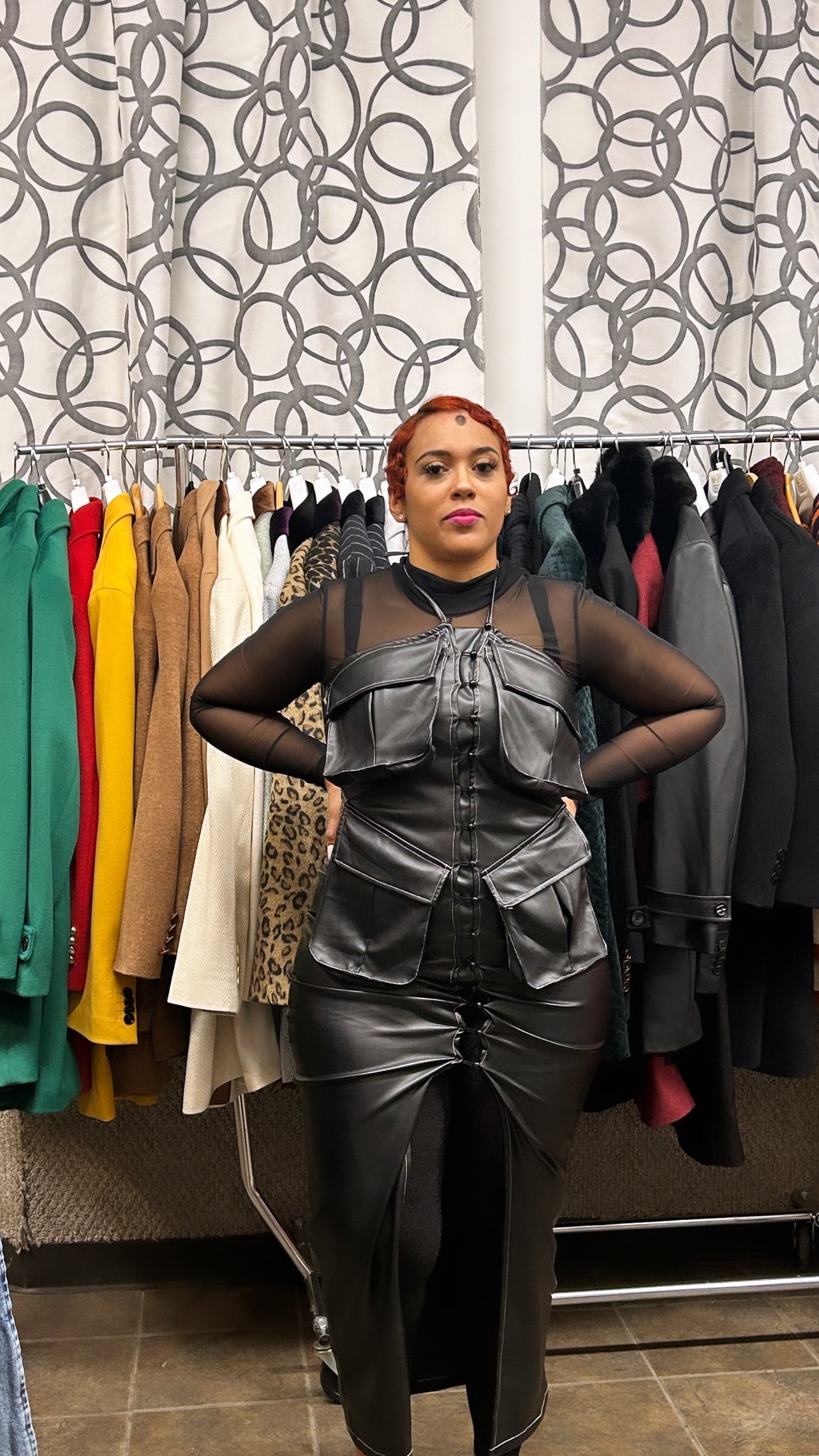 Unleash your inner edge with our Black Leather Dress—a versatile statement piece that seamlessly transitions from daring to polished. Elevate your style by pairing it with a sultry mesh turtleneck for a bold, fashion-forward look, or opt for timeless sophistication with a crisp white blouse underneath. Embrace the power of versatility and make a lasting impression with this wardrobe essential.