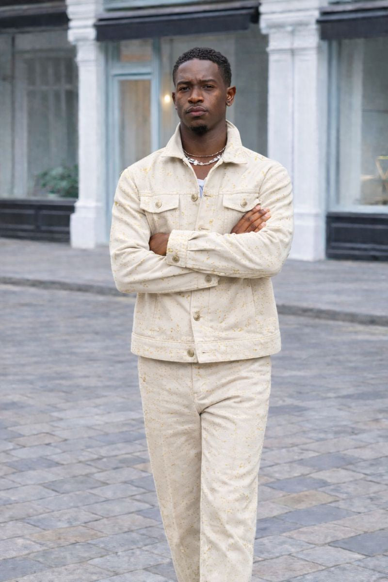 Men’s two-piece knit set featuring a gold spotted pattern for a bold, stylish statement. The single-breasted top offers a tailored yet comfortable fit, while the slightly flared pants provide modern movement and a sophisticated silhouette. Perfect for casual outings, elevated streetwear, or premium online fashion shopping in Chicago.