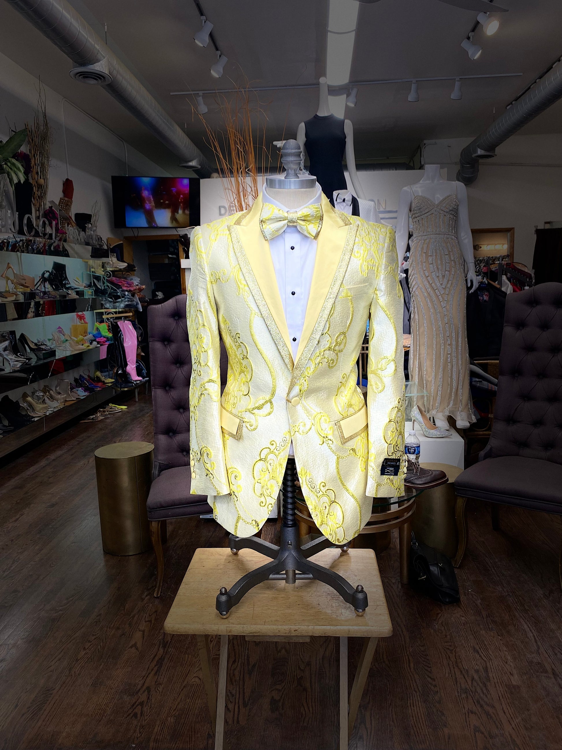 Yellow gold and off white tuxedo prom package $499 includes 2pc tuxedo, shirt, bow tie, and selected shoes