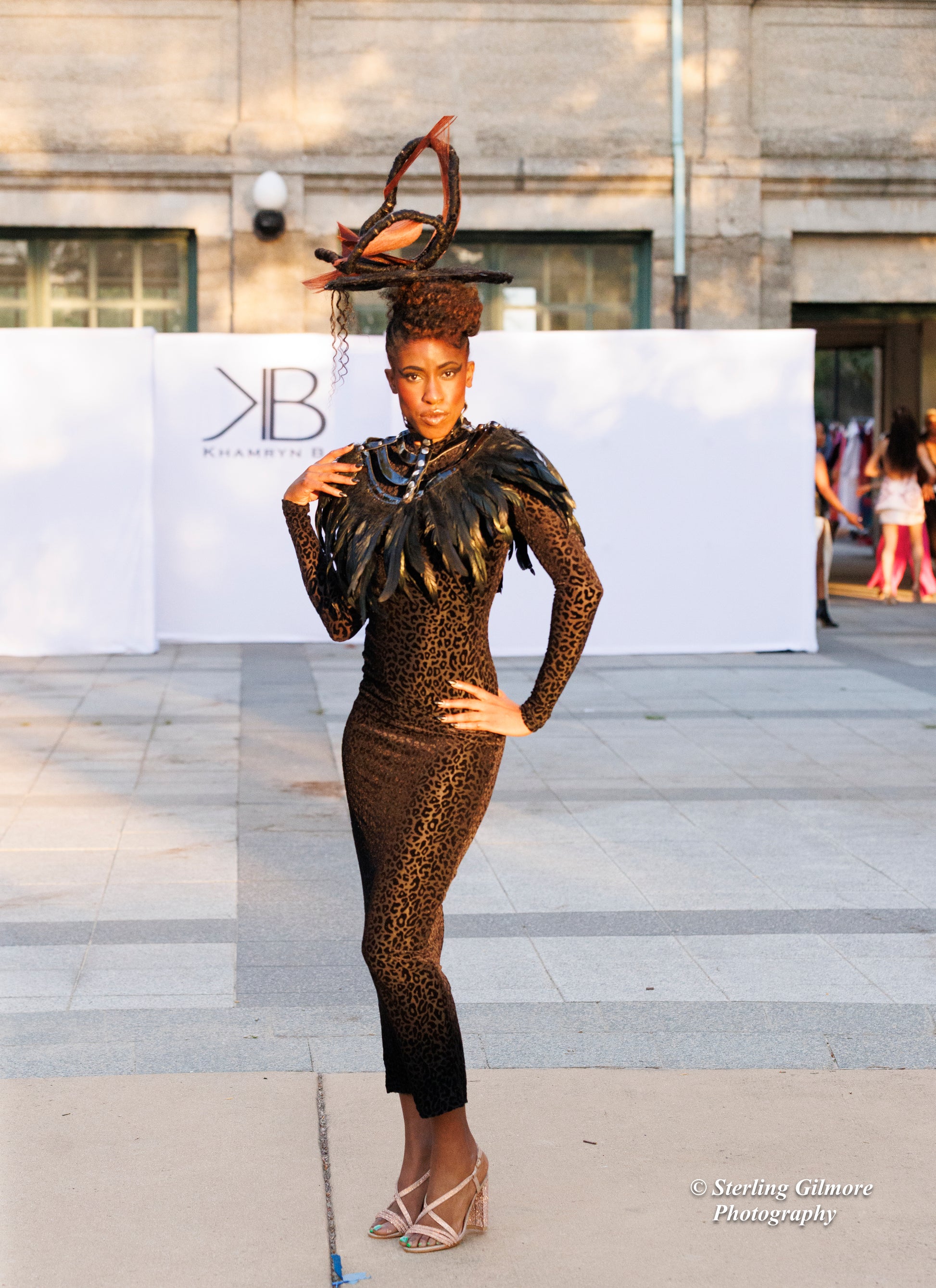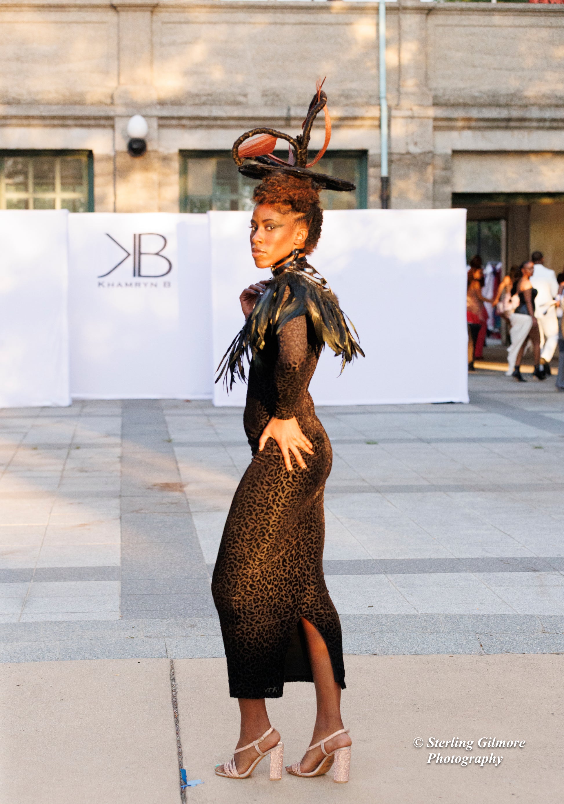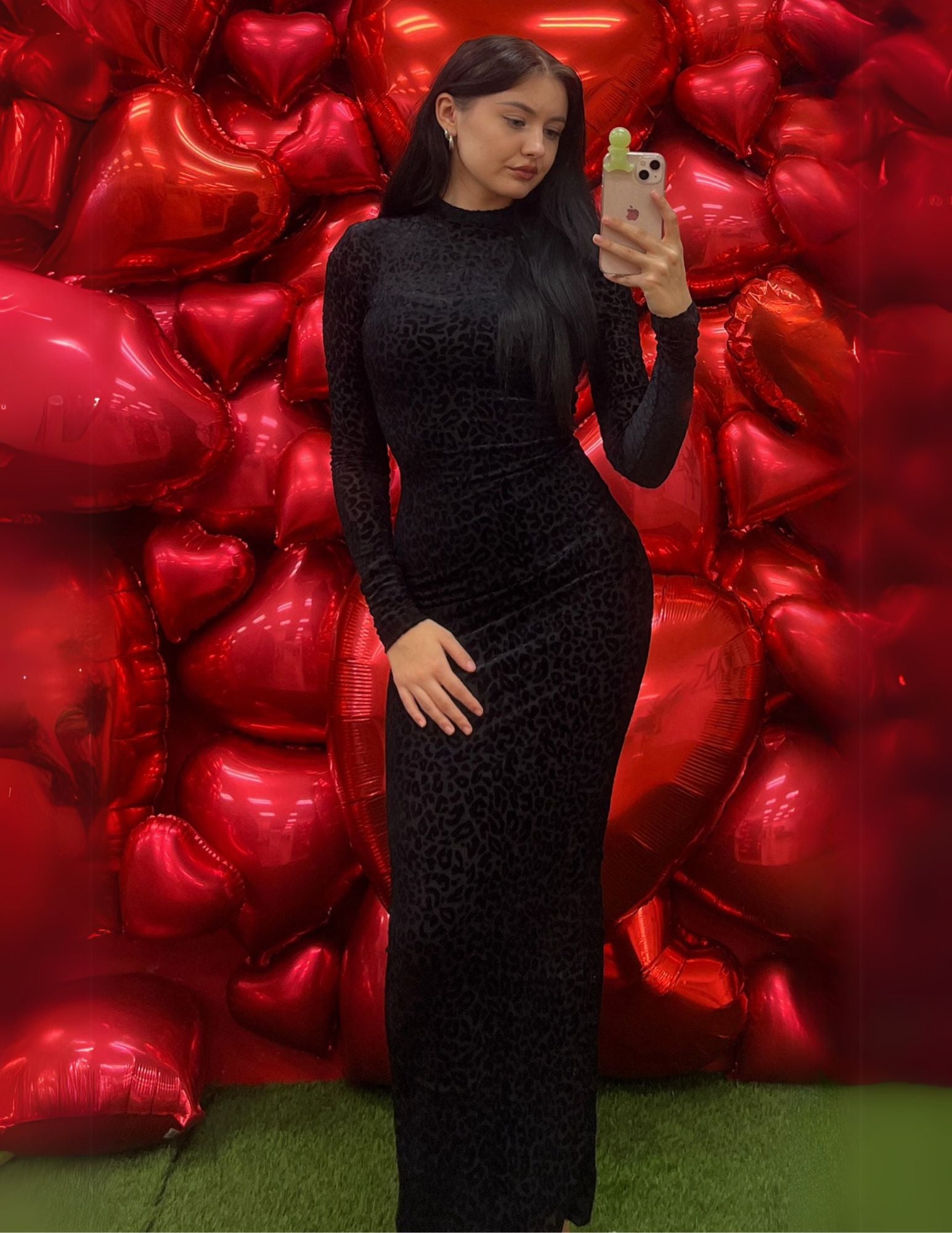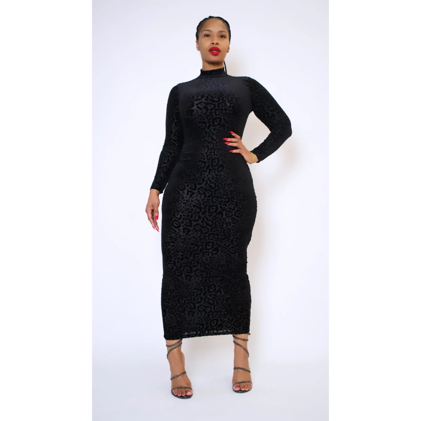 this floor-length black gown features a subtle yet striking velvet leopard print that adds texture and allure. The body-hugging silhouette enhances the figure, while the sheer long sleeves and high neckline offer a sophisticated balance.