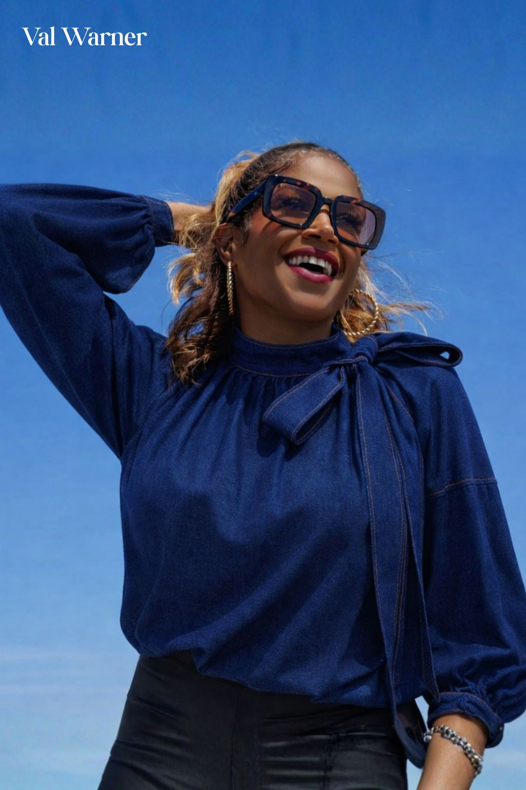A soft, stretchy denim-blue top featuring a bold, elegant bow for the perfect touch of effortless style. Dress it up or down-cute,simple and eye catching