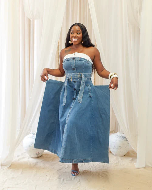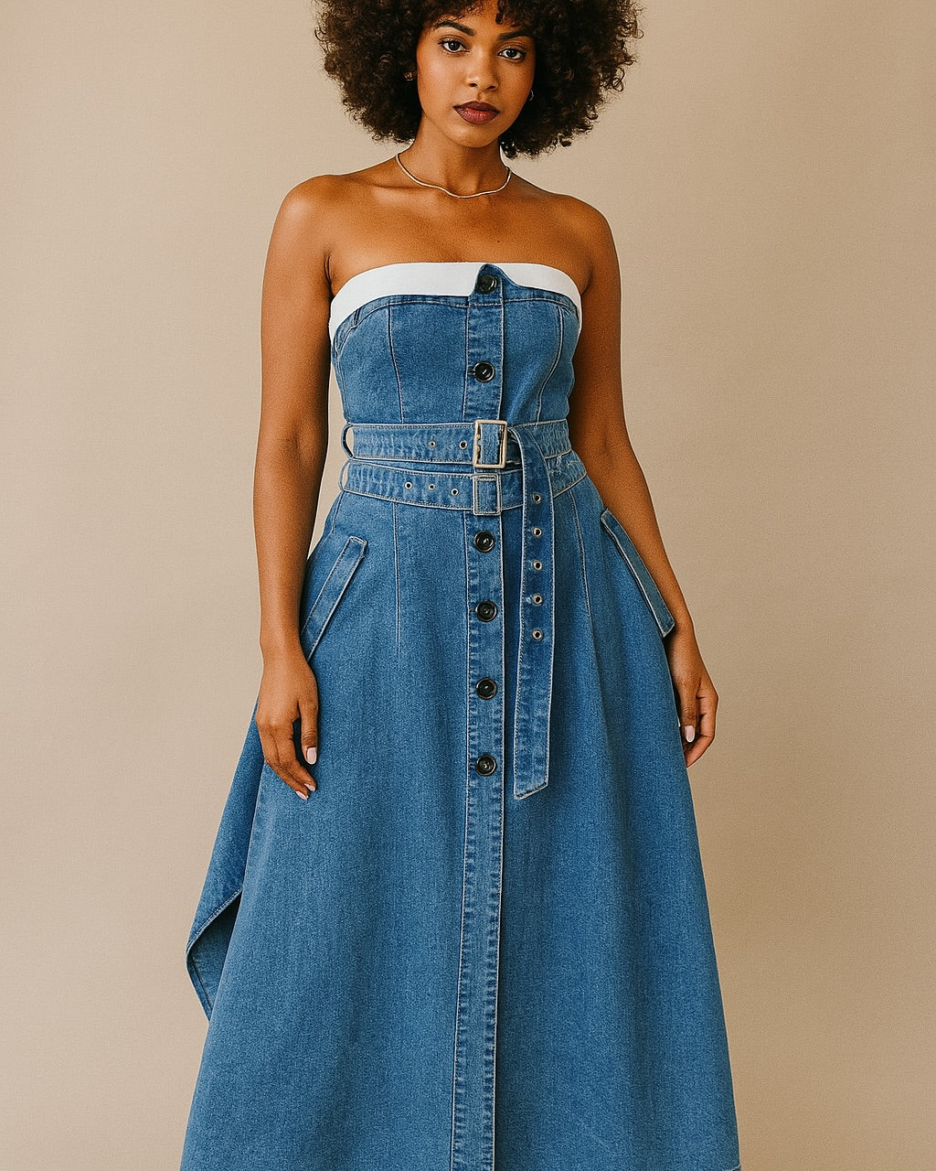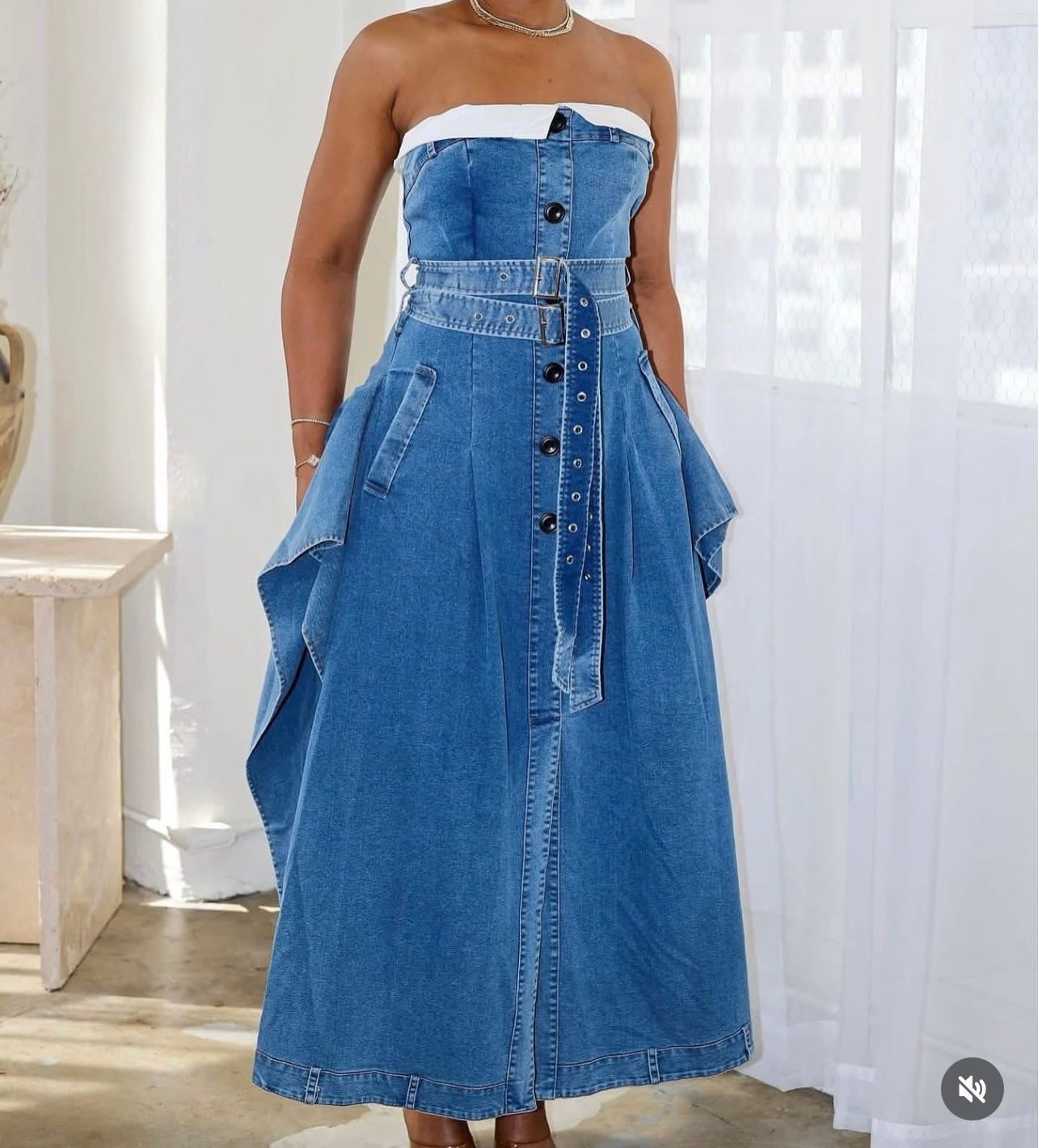 This dress is giving denim diva meets runway rebel! 💙✨ It's like your favorite pair of high-waisted jeans got a glow-up and said, “I’m the main character now.” With its strapless cut, bold button-down front, cinched belt waist, and those dramatic hip flares that scream drama but make it fashion — this piece is not just a look, it’s a moment.