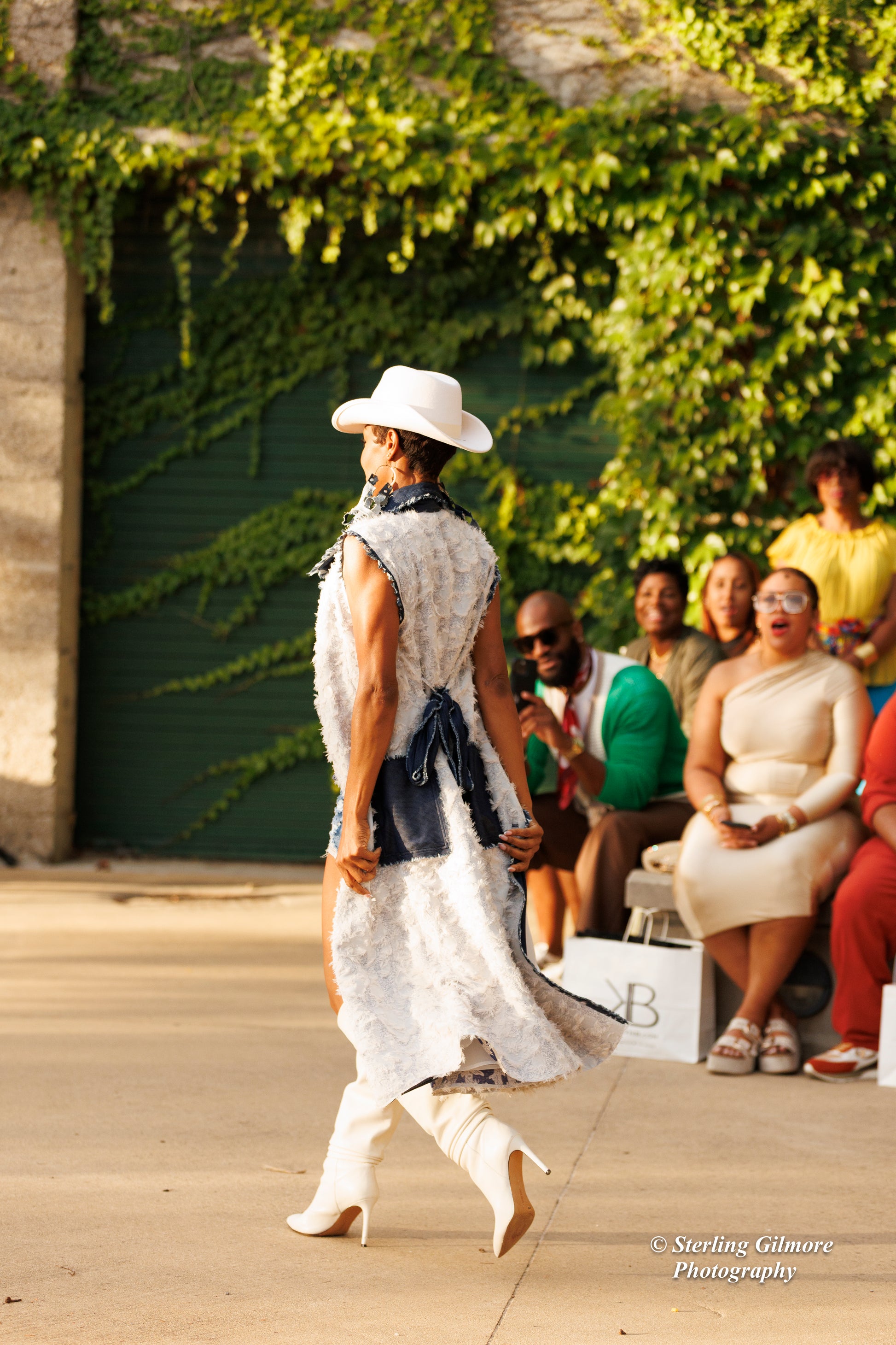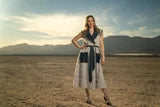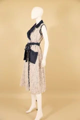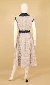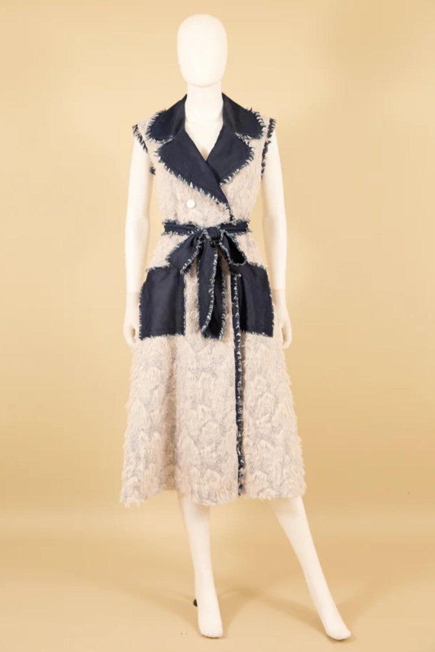 A sleeveless lace midi dress featuring a deep navy lapel collar, matching oversized pockets, and a wide waist tie for a flattering silhouette. The intricate lace overlay is balanced by bold contrast details, making it a perfect choice for chic daytime outings or elevated evening events.