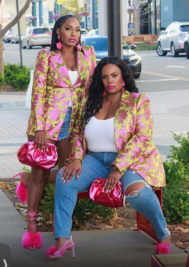 This chic and vibrant duo features matching blazers in a bold pink and gold floral pattern, bringing a touch of luxury to casual street style. The tailored blazers are paired with ripped jeans and white tops for a balanced, effortlessly stylish look. Each outfit is accessorized with pink statement earrings, fluffy pink heels, and shiny metallic pink clutch bags, adding playful, feminine touches. The bright colors and sleek tailoring make these outfits perfect for a day out or a stylish event.