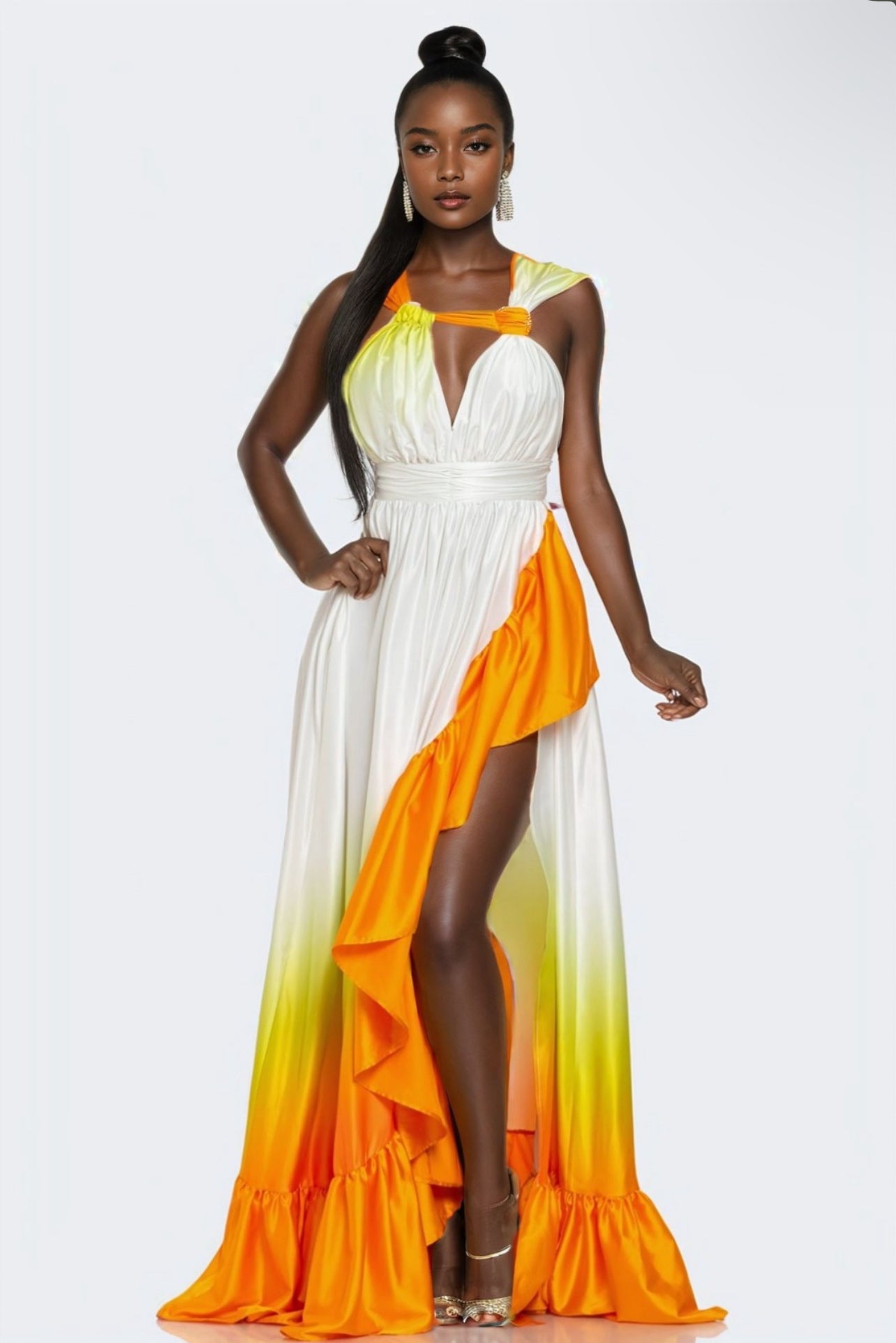 The dress boasts a flowing design with a high slit and ruffled accents, enhancing its elegant and ethereal appeal. The top includes a flattering V-neckline and unique knot shoulder details, adding a touch of sophistication to the overall look.