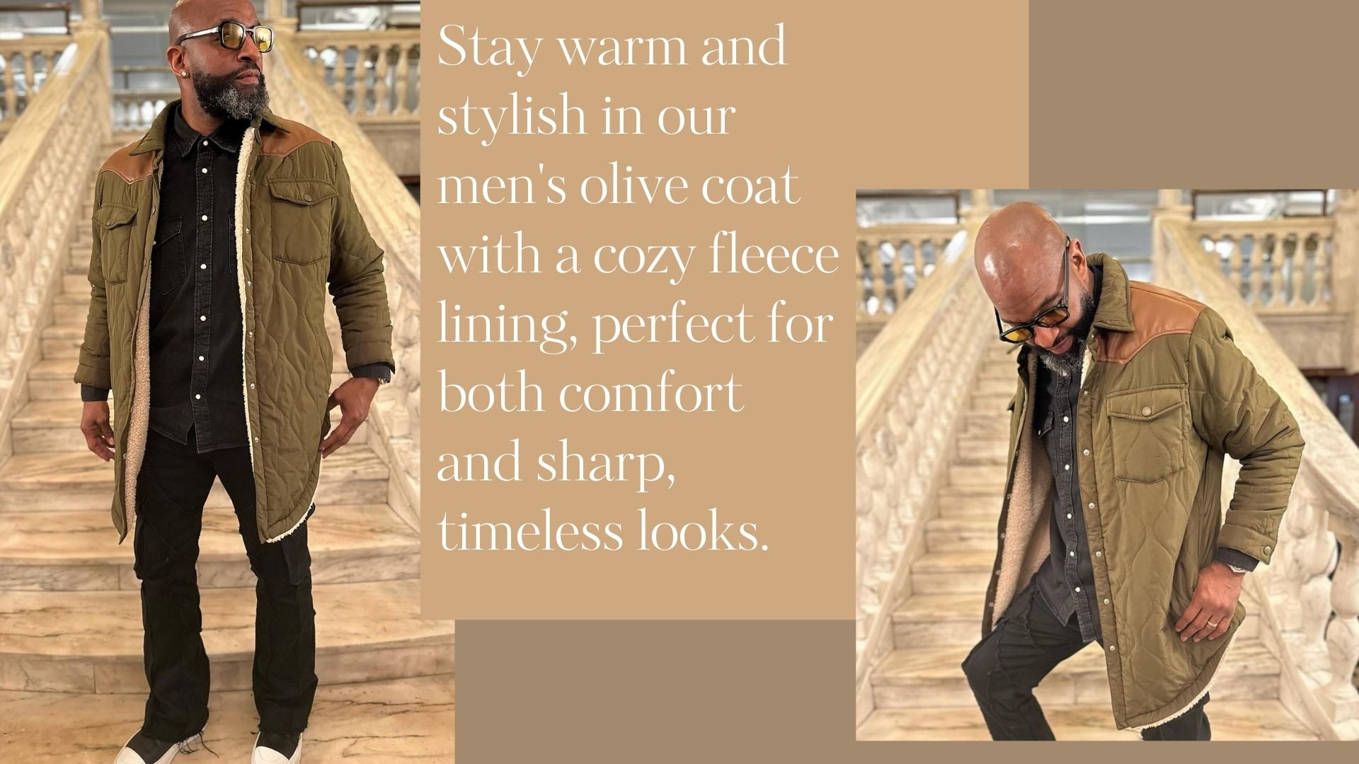 Great olive coat can be paired with jeans, cargo pants or joggers. Tan faux leather shoulder accent and fur lining