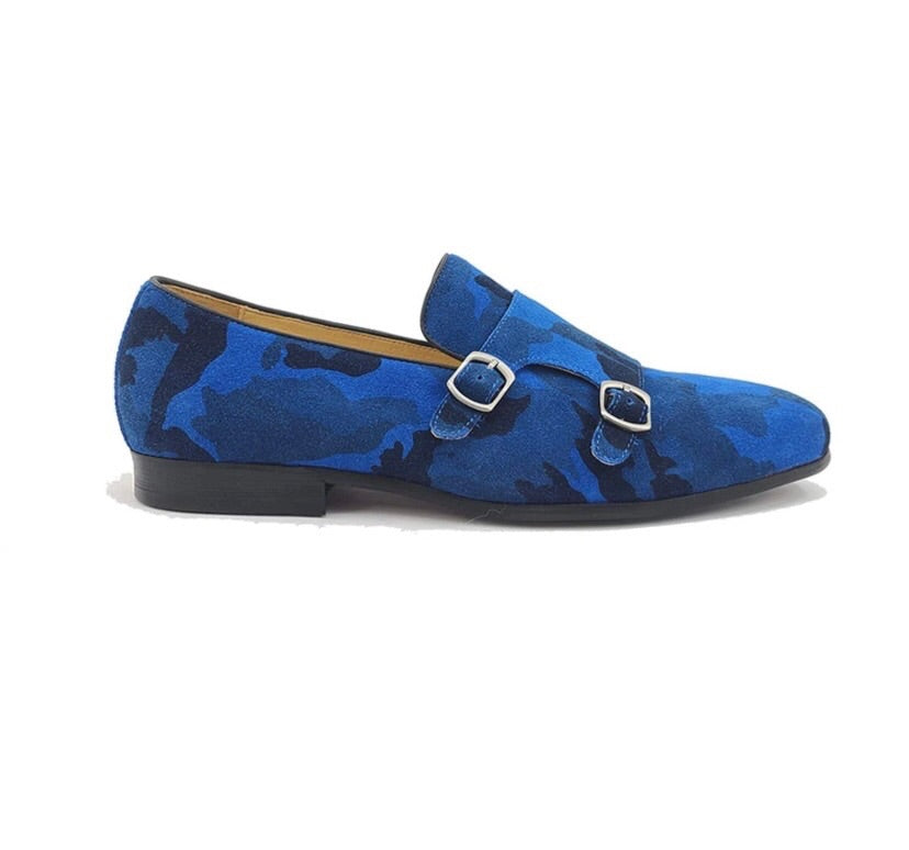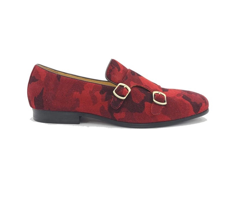 Only for the dapper and most trendy men, this camouflage print slip on features a double monk strap with silver buckle shirt on the side.