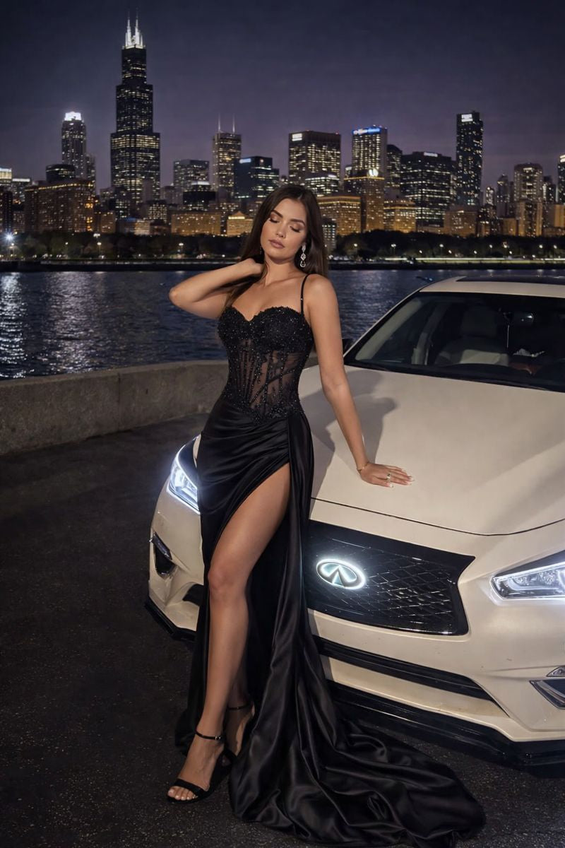 Indulge in refined elegance with our embellished lace and satin fitted gown. This exquisite dress seamlessly combines the delicate beauty of lace with the luxurious sheen of satin, creating a breathtaking ensemble fit for the most special occasions. The fitted silhouette accentuates your curves, while the intricate lace detailing adds a touch of romance and sophistication. Embellishments scattered throughout the lace lend a subtle sparkle, catching the light with every movement. Our fabulous formal collection is special order allow 7-14days for shipping. Need flex payments use shop pay or after pay at checkout to easily divide into 4equal payments. Or call and ask for $100 deposit options 773-881-3296