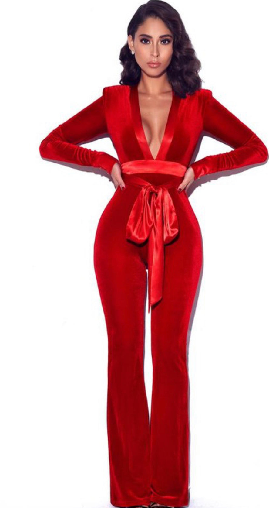 Lux velvet with satin trim wide leg jumpsuit. Available for order.
