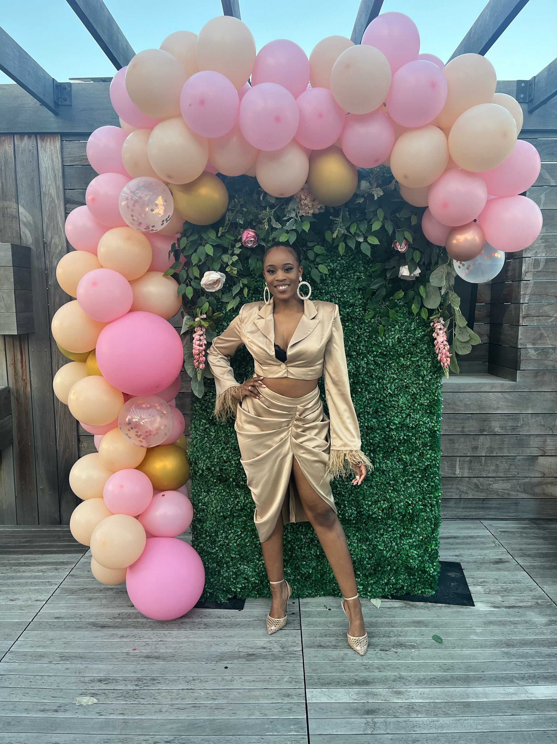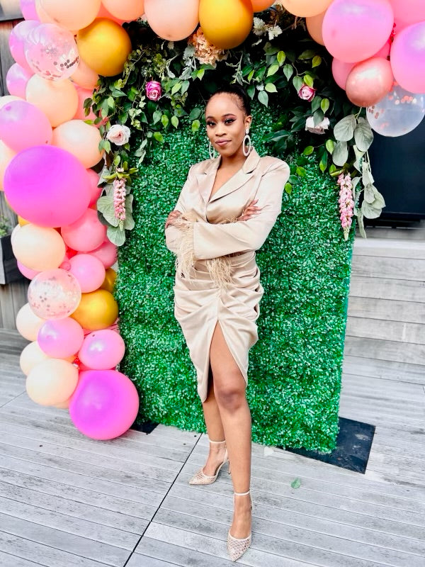 Roaring twenties 2 piece set features a cropped blazer jacket with feathered trim on the wrist. Side dropped designed skirt that can be worn at waist or high waisted for minimum mid drift appearance.