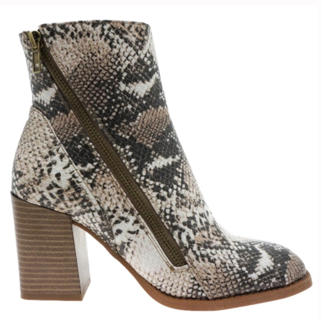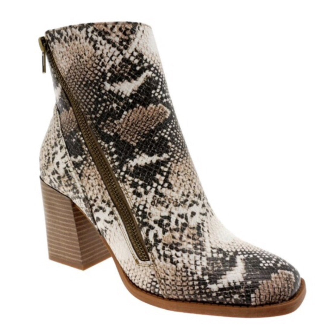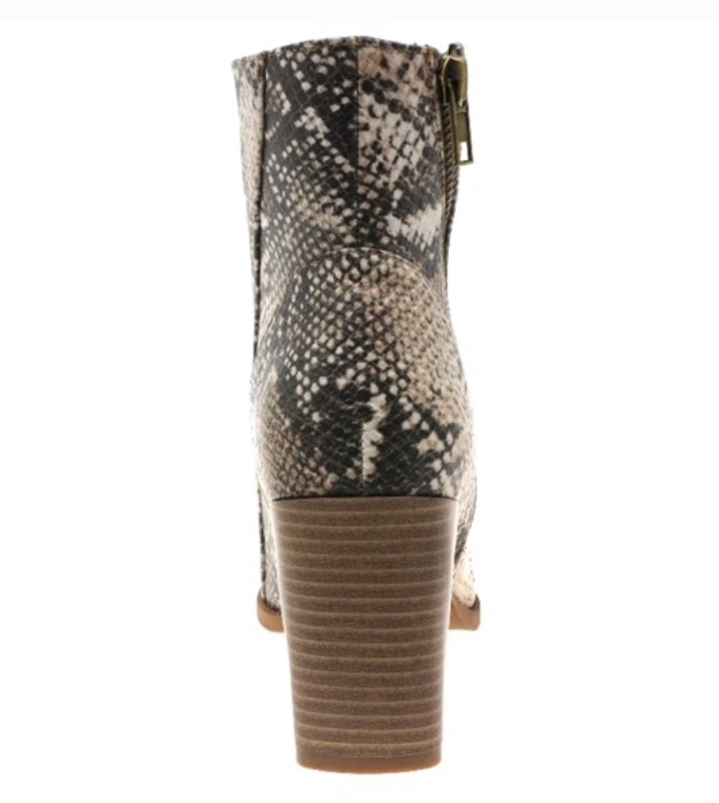 A stylish snake print square-toe ankle boot. The zipper is angled along the inside of the boot and the block heel gives a nice amount of height and sophistication.