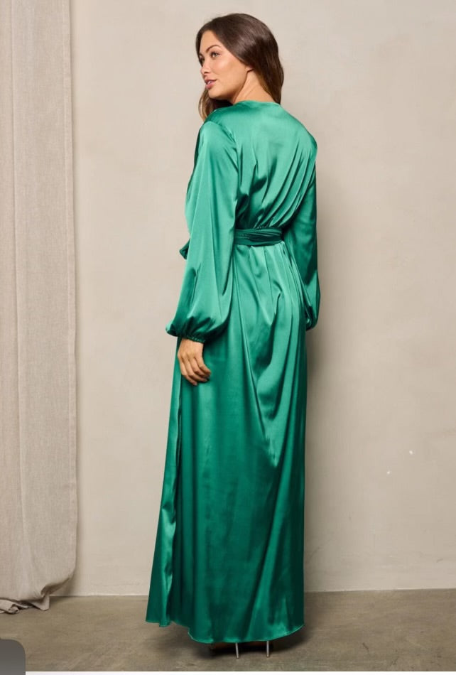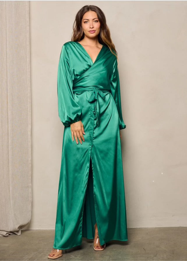 Elevate your style with the stunning Shawn wrap dress in a luxurious green satin finish. This full-length dress features a flattering wrap design that accentuates the waist with a tie belt, creating a sophisticated silhouette. The deep V-neckline and long, voluminous sleeves add a touch of elegance, making this dress perfect for special occasions or a glamorous night out. The dress flows gracefully with each step, offering both comfort and style, while the front slit adds a subtle hint of allure. Make a statement in this beautifully crafted piece.
