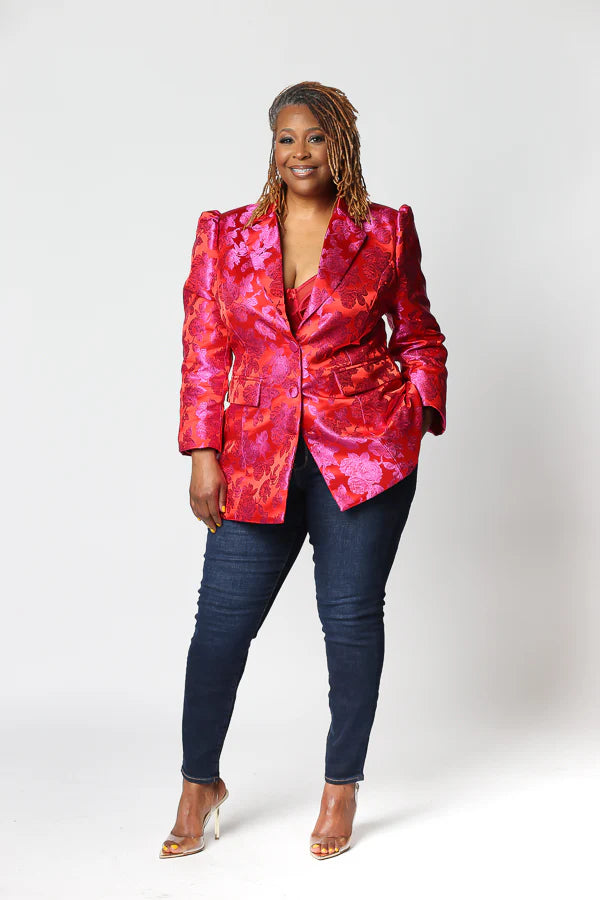 This bold red blazer, with a pop of fuchsia floral embroidery, brings a playful yet fierce vibe. Its slight puffed shoulders add a dash of drama, making you feel like you're stepping out of a stylish daydream!