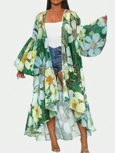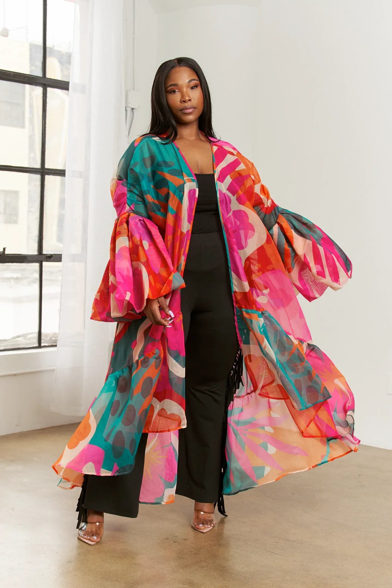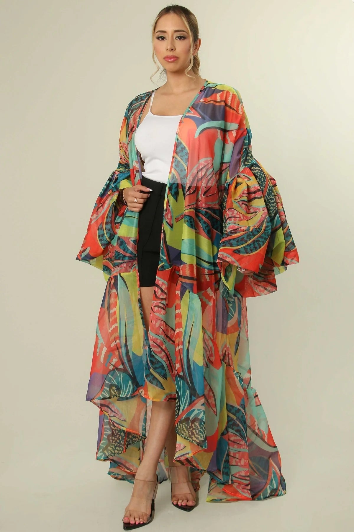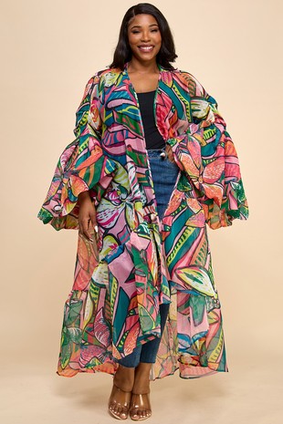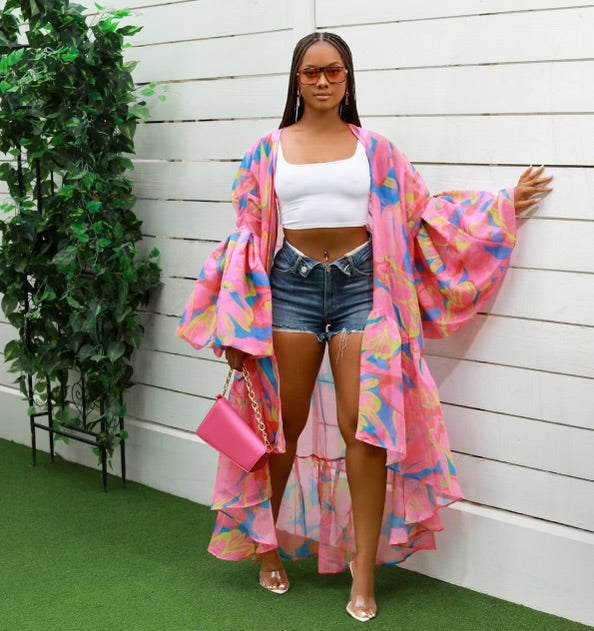 Fabulous kimono styled duster full of color perfect to pair with shorts or pants to dress up or down