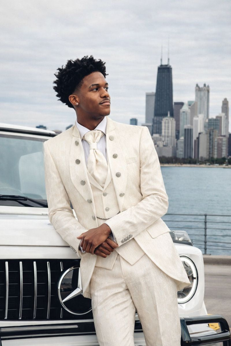 Exude power and sophistication in the Regal Commander Tuxedo — a cream jacquard suit featuring a structured high collar, bold silver buttons, and a sleek chain detail. Complete with a matching vest and cravat-style tie, this look is perfect for the prom king who’s ready to lead with unmatched style and authority.