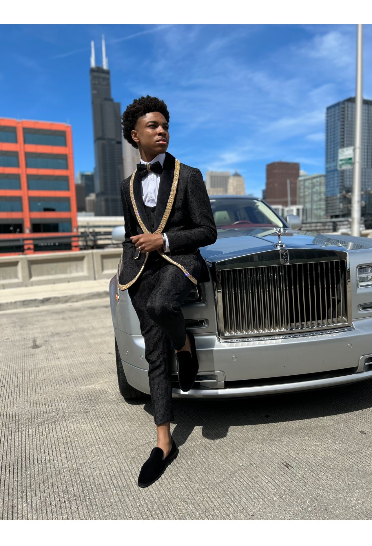 Step into luxury with the Royal Noir Tuxedo — a tailored black jacquard suit featuring an intricate gold-trimmed shawl lapel and velvet accents. Complete with a crisp white shirt, black bow tie, and slim-fit trousers, this show-stopping look is designed for those who demand elegance and attention. Perfect for prom nights where making an unforgettable entrance is a must