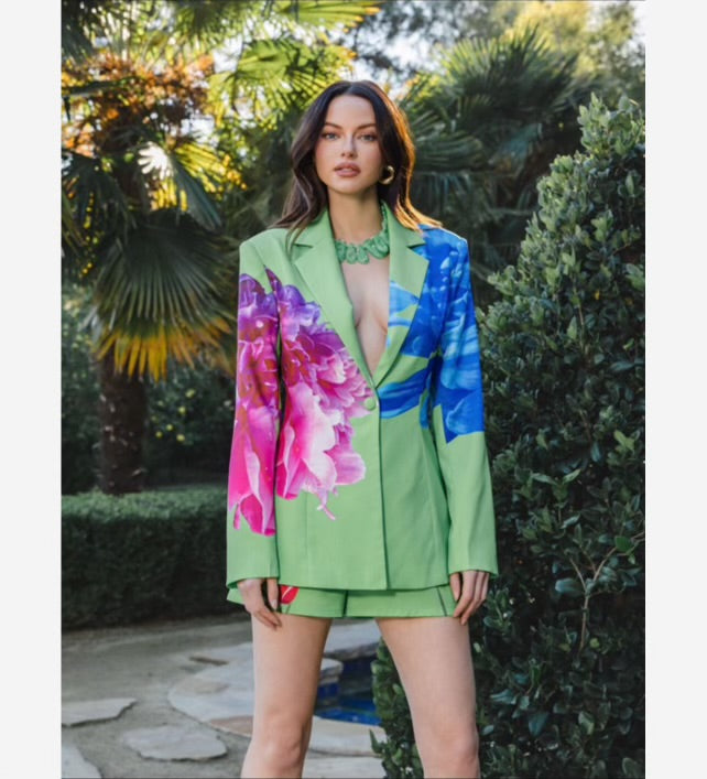 - **Bold Floral Design:** A beautifully crafted blazer adorned with eye-catching floral patterns in vivid hues of pink and blue, creating a stunning contrast against the fresh green fabric.