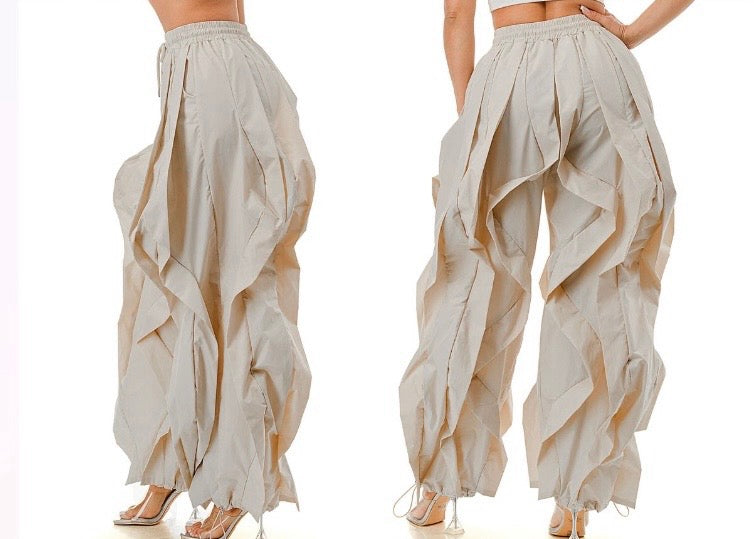 Make a bold statement with these avant-garde Wave Windbreaker Pants, crafted from lightweight nylon for that edgy, streetwear-meets-high-fashion vibe. Designed with dramatic, cascading wave-like pleats and ruching from waist to hem, these pants deliver motion, volume, and attitude in every step. Featuring an elastic waistband with adjustable drawstrings and ankle ties for a customizable fit, they effortlessly blend comfort and couture. Perfect for fashion risk-takers who dare to stand out.
