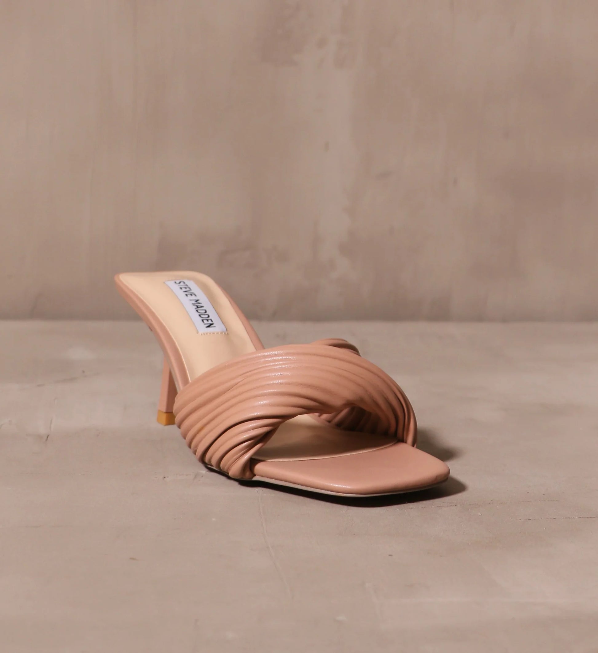 Mid heel quiltted sandal features a cushy luxury band and sexy mule design