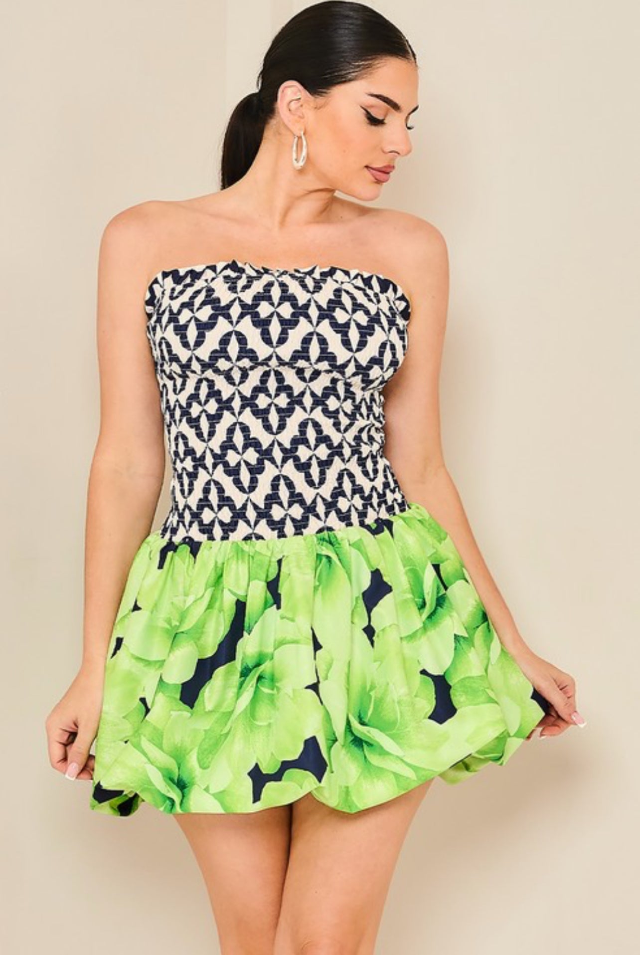 Turn heads with the Zaria Petal Dress — a strapless mini bursting with bold contrasts and playful charm. The smocked bodice features a black and white geometric pattern for a touch of structure, while the voluminous bubble skirt brings the drama with oversized lime green floral prints.